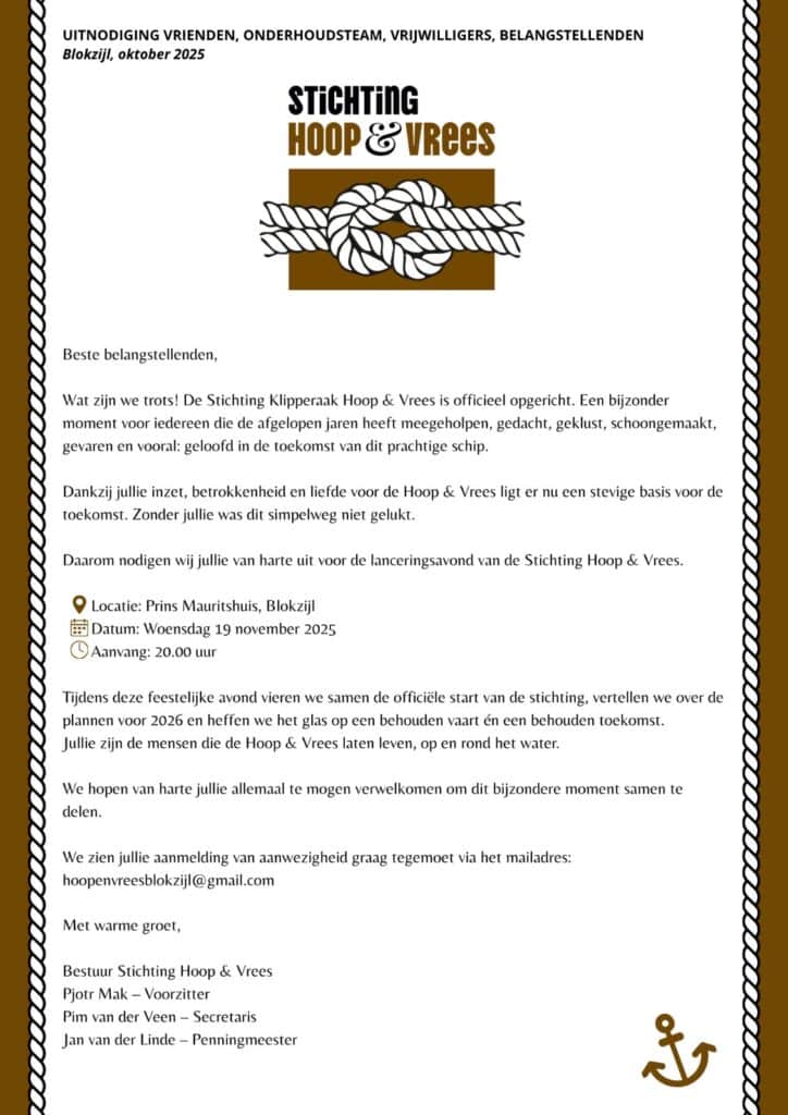 Samen maken we Hoop&Vrees nog mooier in het hart van Blokzijl!Bestuur Stichting Hoop&Vrees